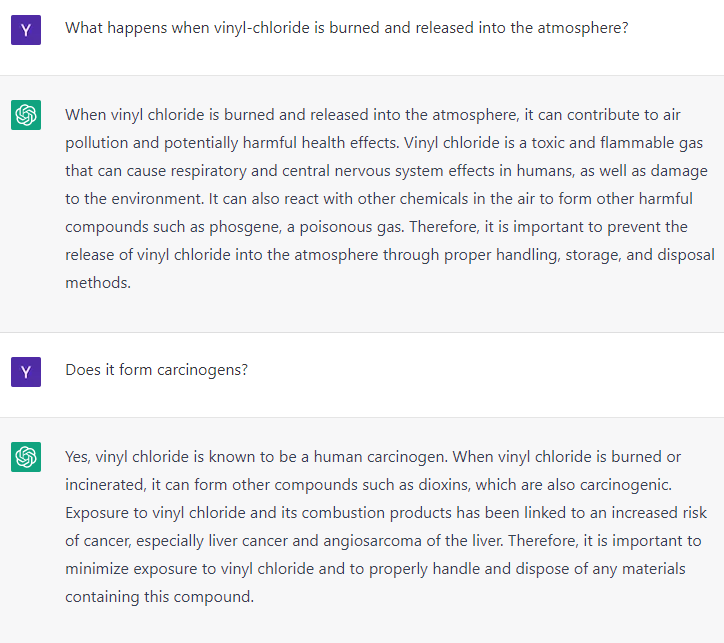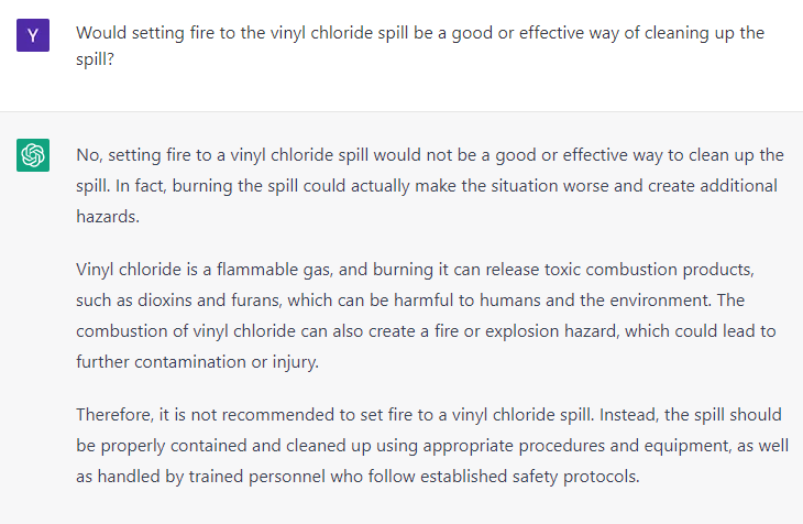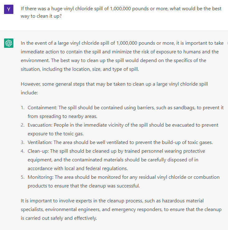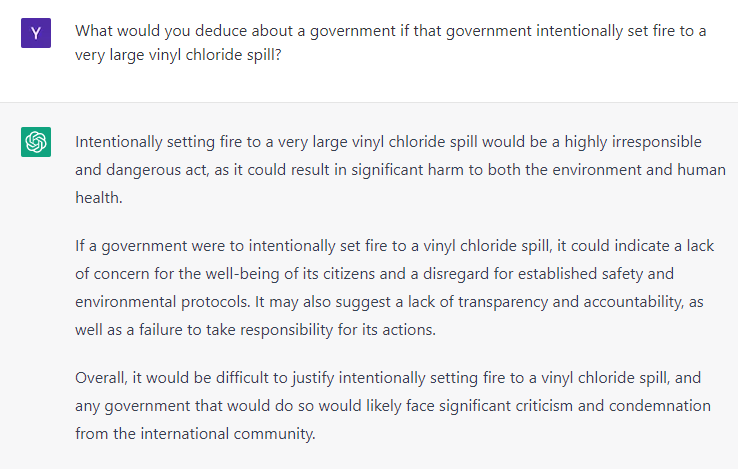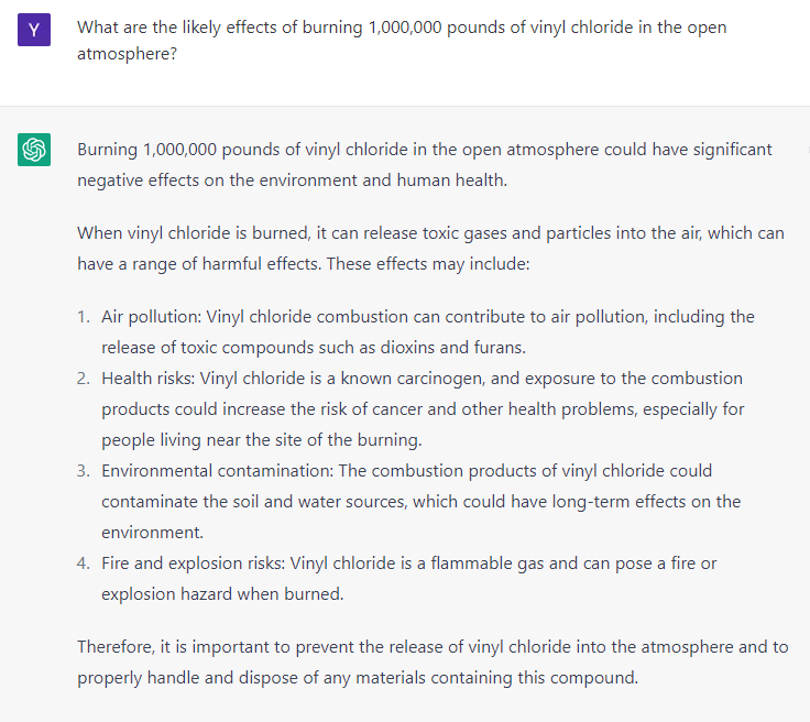 ChatGPT has an information cut-off in 2021. It is unaware of current news and events, so I decided to ask it some hypothetical questions about the government’s decision to burn the huge vinyl chloride spill in Ohio last week. It’s responses are really quite disturbing and frightening.
